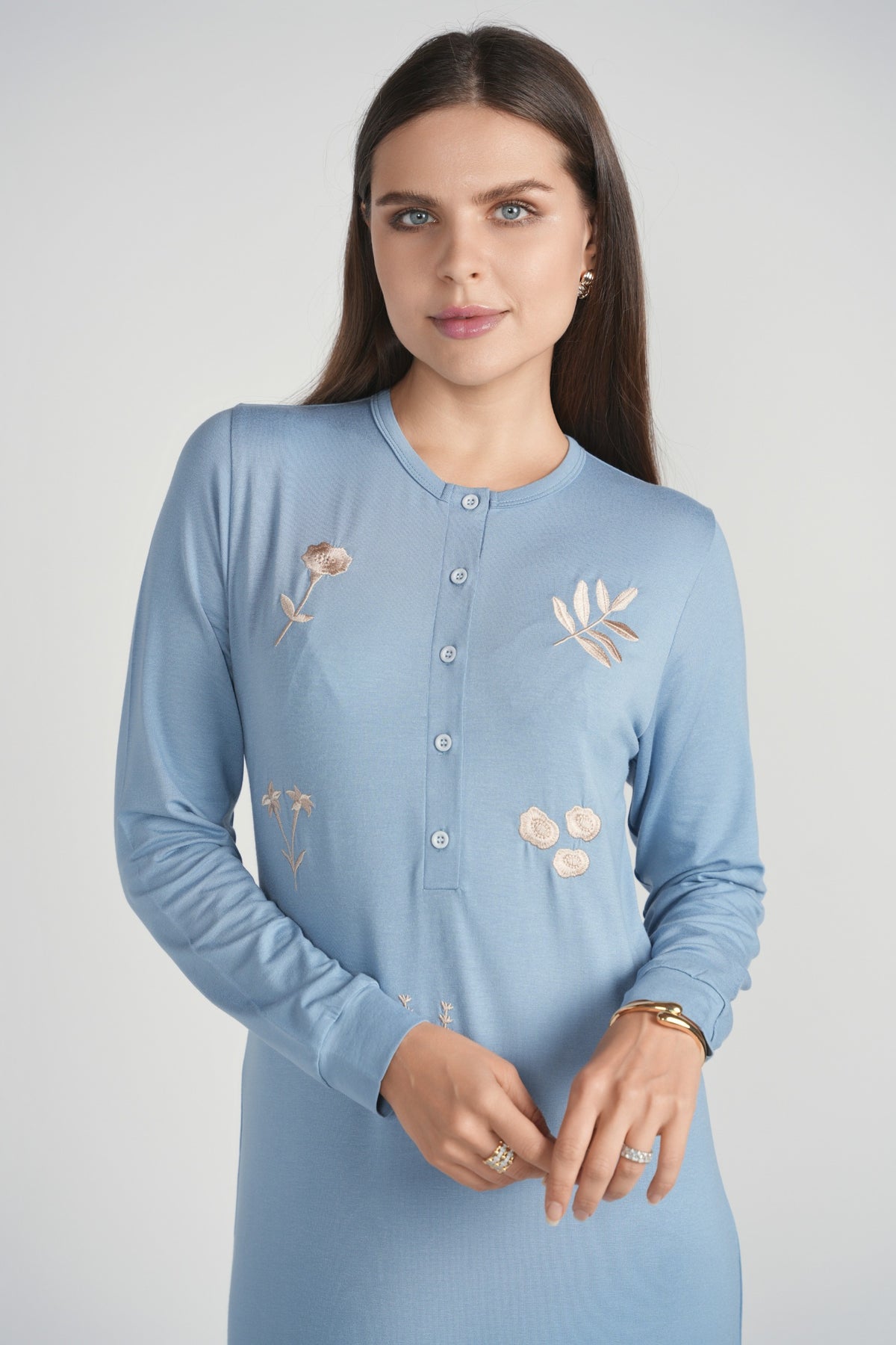 Flower Detail Button Nightgown- Blue